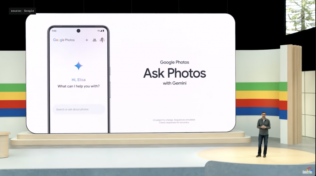 피차이는 최신 AI 모델인 Gemini 1.5 Pro로 구동되는 다양한 새로운 기능을 강조했다. 에스크 포토(Ask Photos) 기능에서 사용자는 저장된 사진을 통해 세부 정보를 더 정확히 알아낼 수 있다.