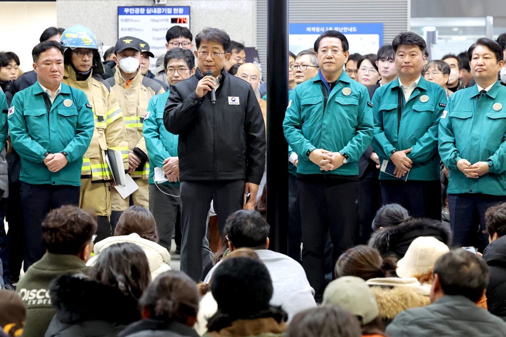 사진/전라남도청 (박상우 국토교통부 장관이 29일 전남 무안군 무안국제공항에서 김영록 전라남도지사 등 관계자들이 참석한 가운데 제주항공 여객기 폭발사고 탑승객 가족들 앞에서 브리핑을 하고 있다.)