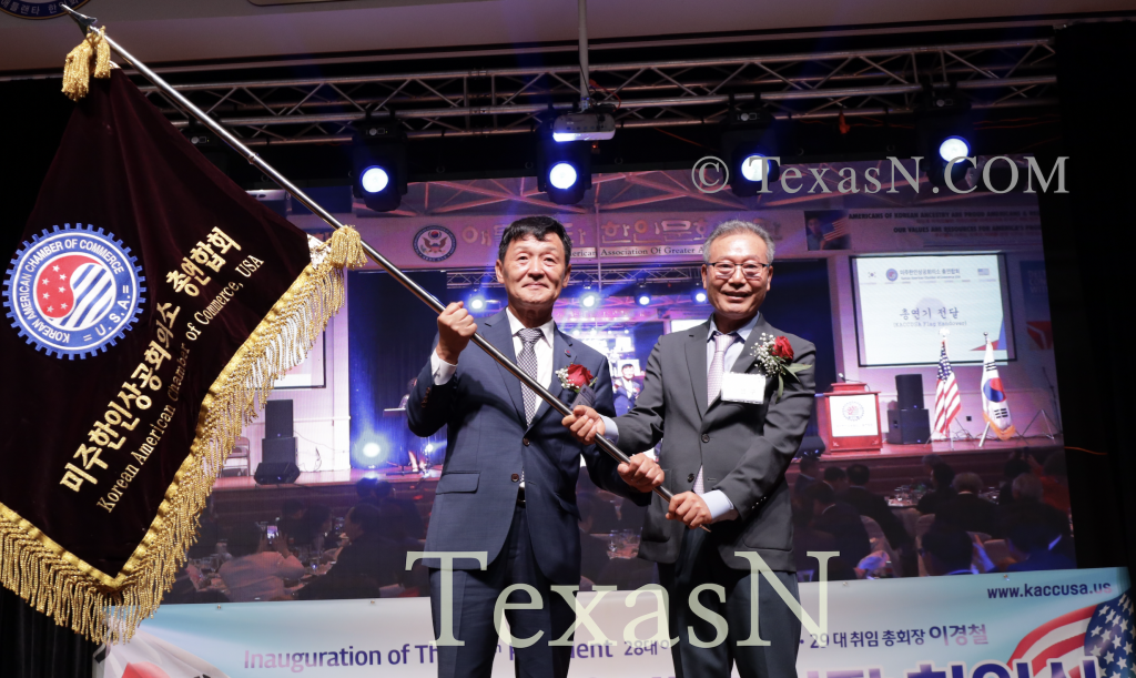 사진/ 미주한인상공회의소총연합회 29대 신임 이경철 총회장(사진왼쪽)이 28대 황병구 총회장으로부터 총연기를 전달받으면서 미주한상총연 이경철 총회장 체재의 시작을 알렸다.