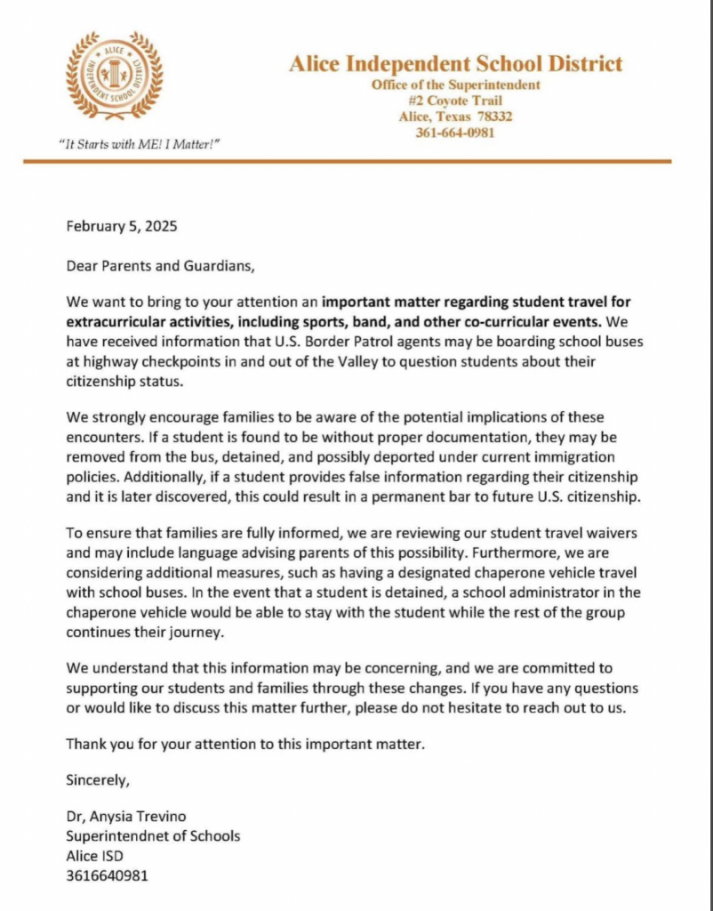 앨리스 교육구의 아니시아 트레비노 교육감은 학보모들에게 보낸 편지에서 학생이 신분증이나 합법적인 체류를 증명할 수 있는 서류를 소지하지 않은 경우 해당학생은 버스에서 내려야 하며 구금되거나 추방될 가능성도 있다고 경고했다.