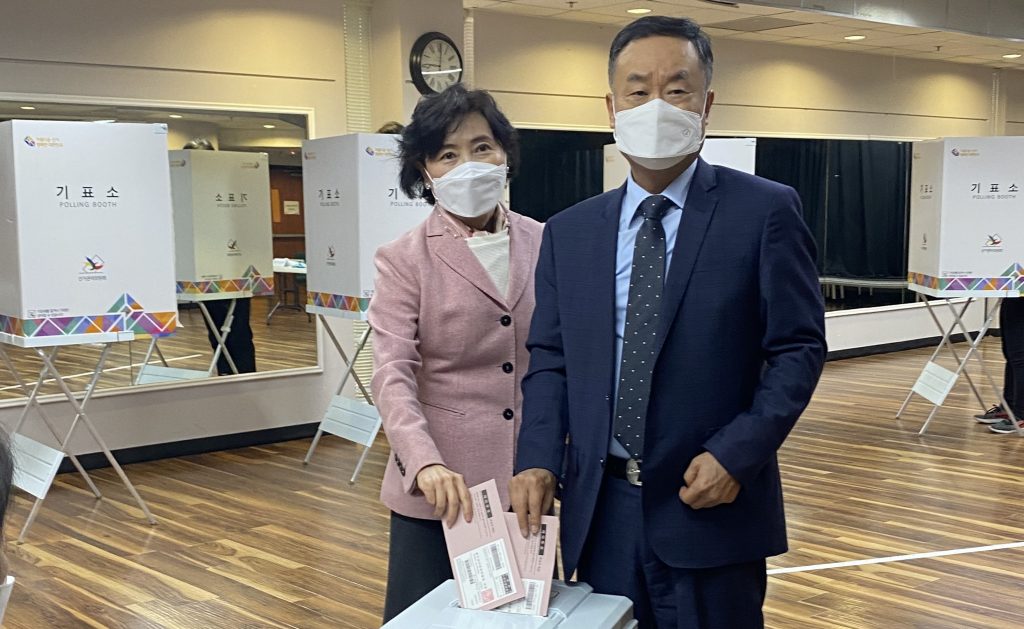 오늘(23일)부터 시작한 재외선거에 주휴스턴총영사관 안명수 총영사 내외가 투표에 참여했다.  안명수 총영사 내외는 투표에 앞서 마스크를 잠시 벗으며 본인확인 작업을 진행했다.
