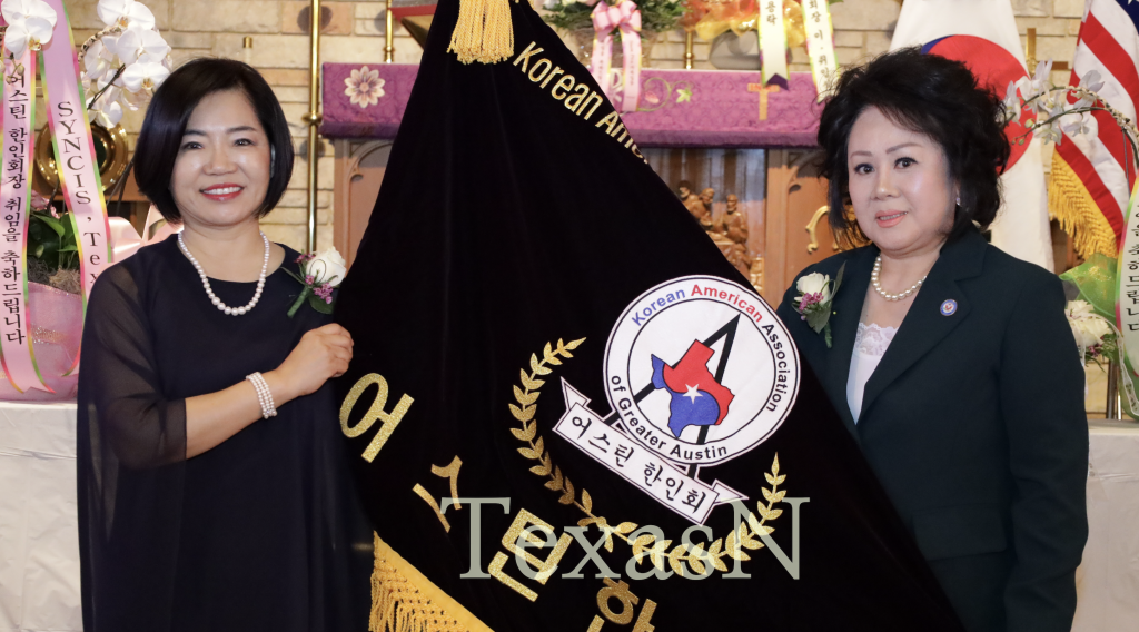 [사진=텍사스N] 25대 오스틴한인회 이희경 회장(사진 오른쪽)이 신임 이옥희 회장(사진 왼쪽)에게 한인회기를 전달했다.