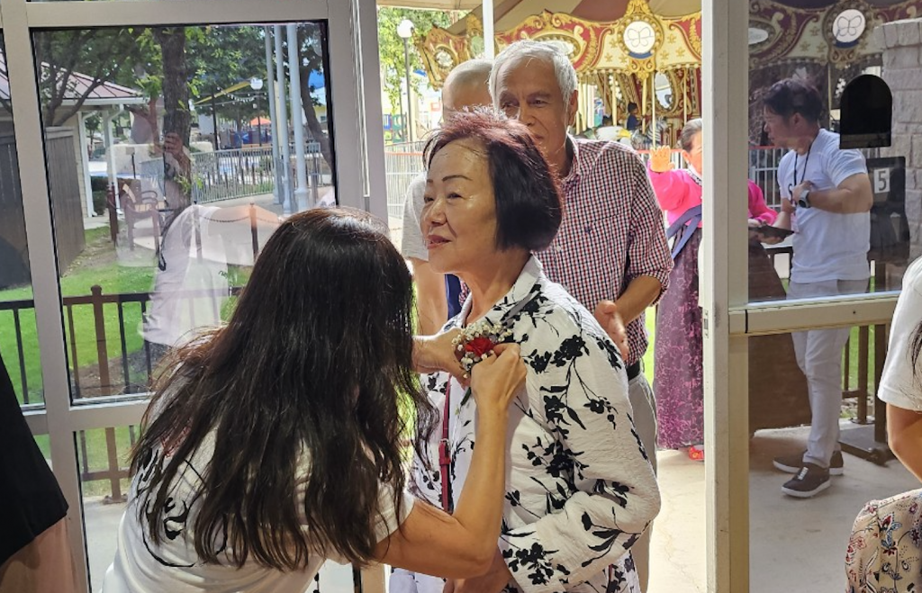 사진/ 샌안토니오 한인회 임원들이 어버이날 행사에 참석한 한인어버이에게 카네이션 꽃을 달아주고 있다.