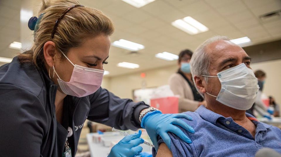 사진/ 포브스 (Jose Martinez gets his Moderna Covid-19 vaccine at a vaccination site at a senior center on March 29, 2021 in San Antonio, Texas)