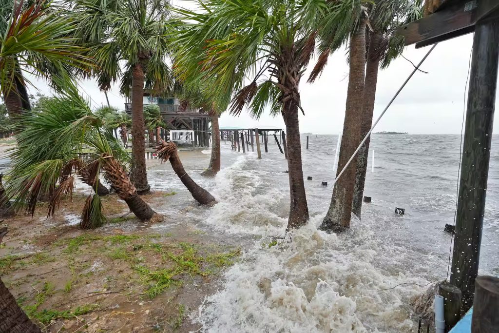 사진/ Storm surge pushes water past wind swept palm trees along the Gulf of Mexico, Monday, Aug. 5, 2024, in Horseshoe Beach, Fla. Hurricane Debby made landfall early this morning.(AP Photo/Christopher O’Meara)(Chris O’Meara / AP)