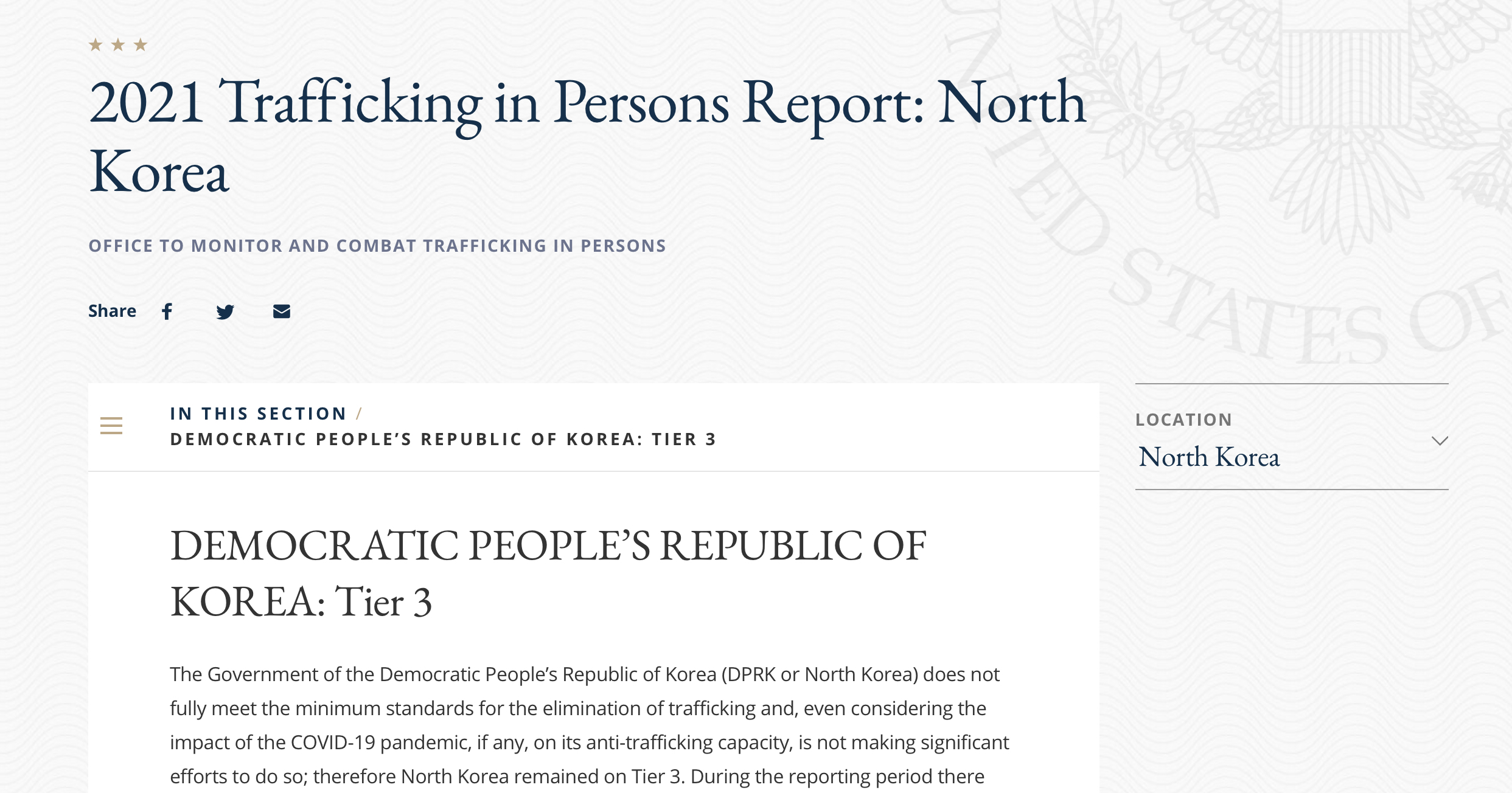미국무부가 1일(목) 북한을 19년 연속 ‘최악의 인신매매 국가’로 지정했다. 연합뉴스 영문판은 국무부는 ‘2021년 인신매매 보고서’에서 북한을 최하위인 3등급 국가로 분류했다고 보도했다. 북한은 지난 2003년부터 매년 최하 등급으로 평가되고 있다.
