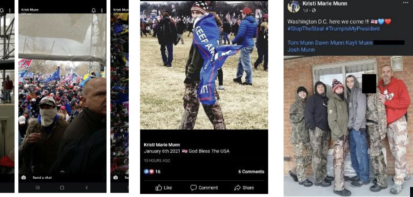 FBI는 텍사스주 북서쪽 끝에 위치한 보거에 거주하는 크리스티 먼(Kristi Munn)의 인터넷 소셜미디어의 계정에서 국회의사당 난입 이전과 이후 관련 게시물들을 대거 확보했다.