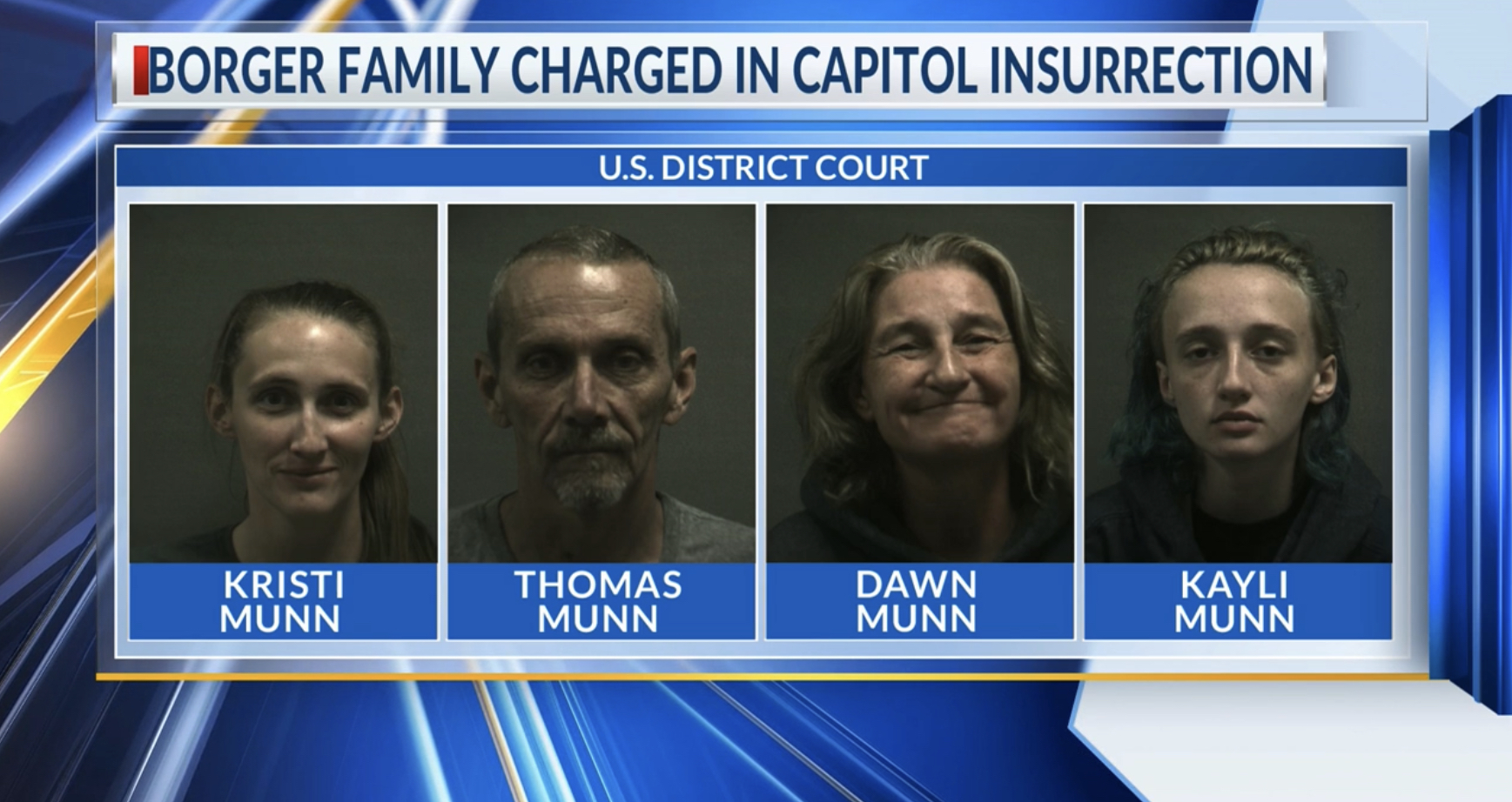 FBI의 디지털 감식 전문가들에 의해 신원이 밝혀진 크리스티 먼의 일가족 5명은 합법적인 권한이 없는 건물에 무단 침입한 혐의와, 기물 파손 및 폭력행위, 국회의사당 내 무질서 혐의, 국회의사당내에서 행진 및 시위 혐의로 기소될 것으로 보인다.