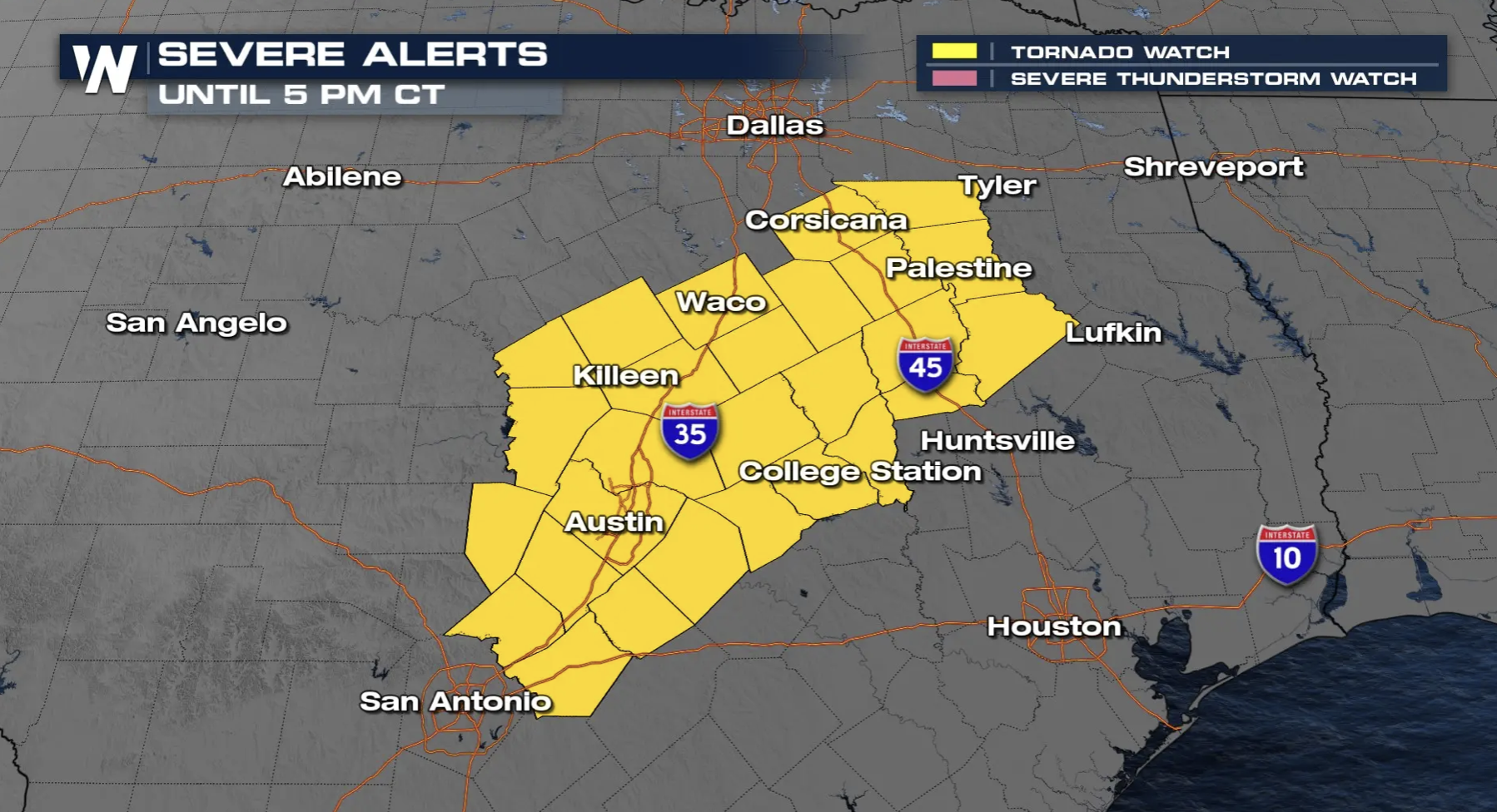 오스틴은 포함한 중부 텍사스 지역에 토네이도 경보가 발령됐다. 토네이도 경보지역은 오스틴 트레비스 카운티와 윌리엄슨 카운티, 헤이스 카운티, 콜드웰 카운티, 배스트롭 카운티, 블랑코 카운티, 리 카운티, 버넷 카운티 등이다. 지도상으로는 샌안토니오 북부 교외지역부터 오스틴을 거쳐 웨이코에 이른다.
