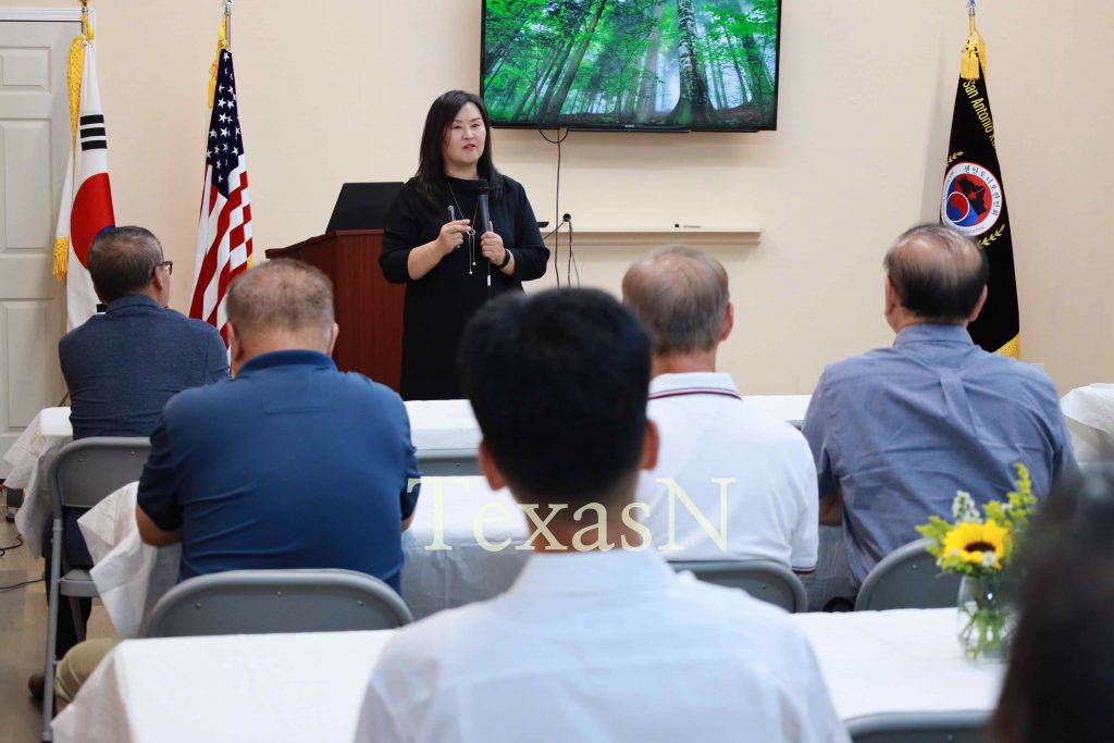 [사진=텍사스N] 샌안토니오 한인장학재단 이문주이사장이 14일 열린 후원의밤 행사에서 장학재단에 대해 설명하고 있다.