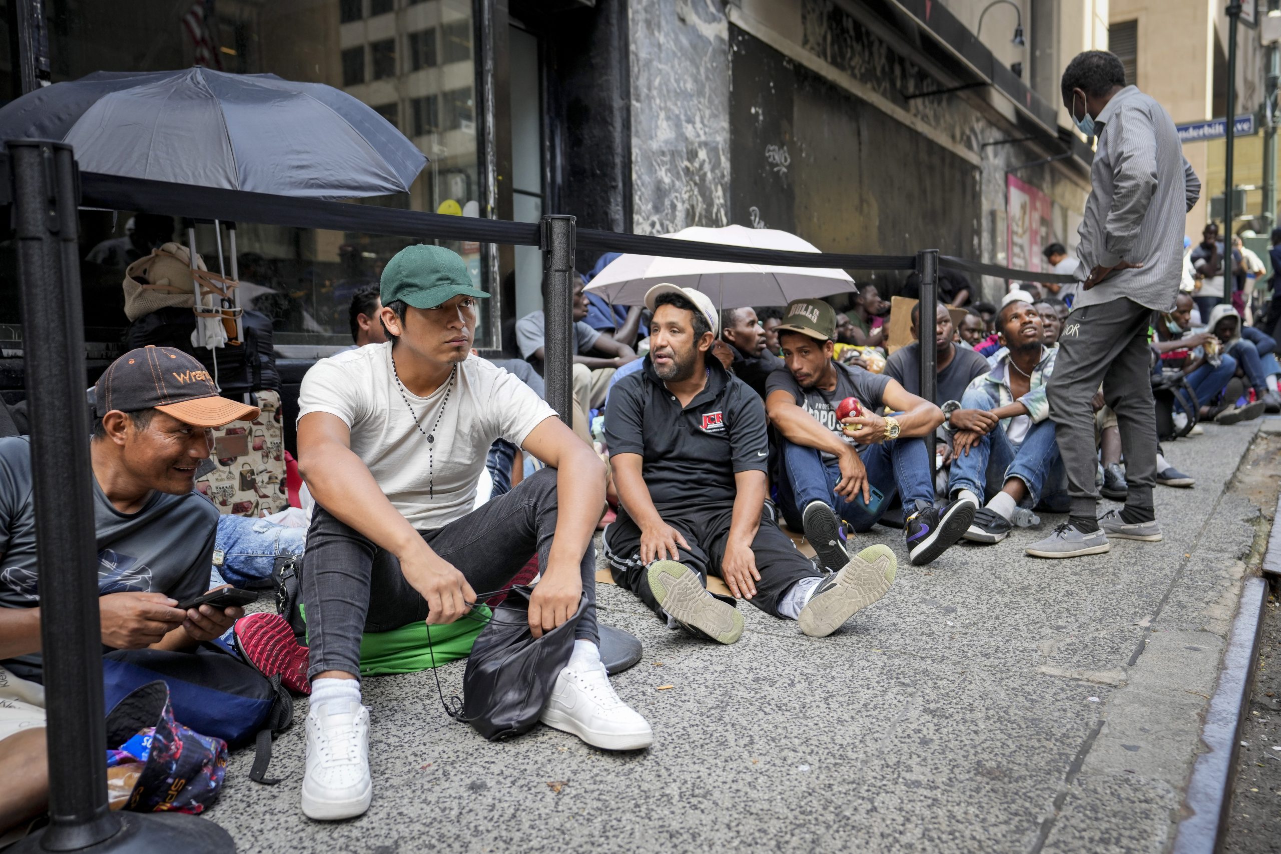 Migrants sit in a queue outside of The Roosevelt Hotel that is being used by the city as temporary housing, Monday, July 31, 2023, in New York. (AP Photo/John Minchillo)