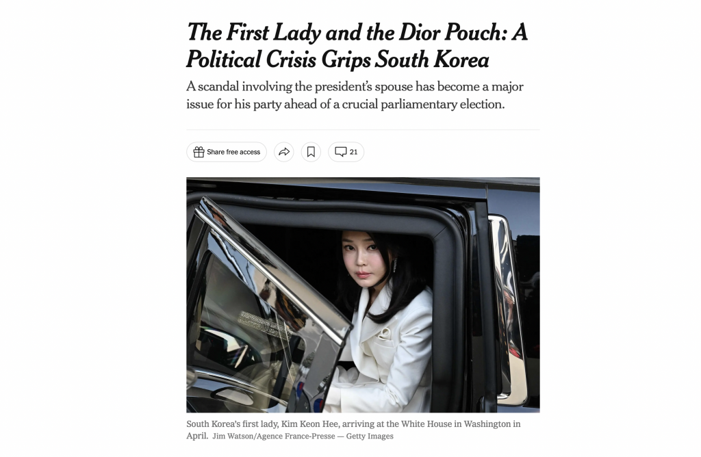 미국의 주요언론들은 김건희 여사가 2,200달러 짜리 디올파우치를 선물로 받은 몰래카메라 영상이 공개되면서 ‘디올백 스캔들’이 한국 총선을 앞두고 주요 쟁점으로 떠올랐다고 분석하고 있다. 뉴욕타임즈는 연이어 해당 논란을 기사화하며 ‘한국의 정치적 위기’라고 진단하고 있다.