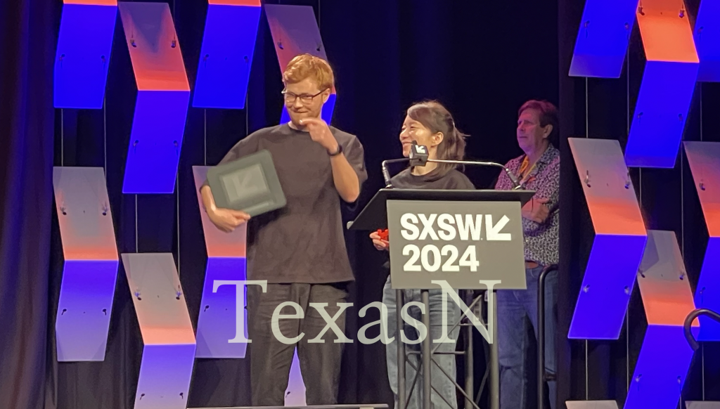 [사진=텍사스N] 사우스바이사우스웨스트 2024 혁신상 커뮤니티 증진부문에서 우승을 차지한 뒤 수상소감을 말하고 있다.