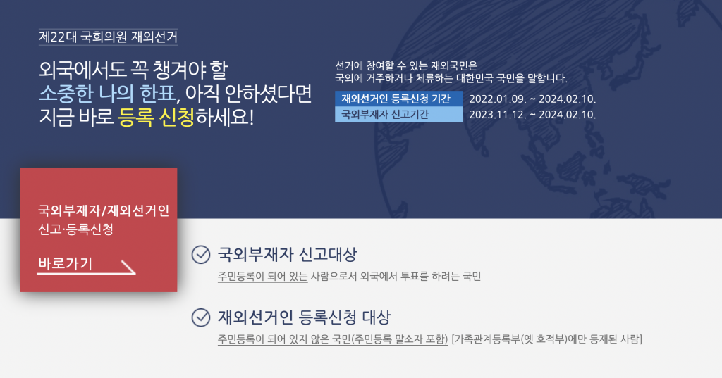내년 4월 10일 대한민국 22대 국회의원 선거가 실시된다. 공직선거법에 따라 22대 국회의원 재외선거도 재외공관을 중심으로 준비한 한창이다.