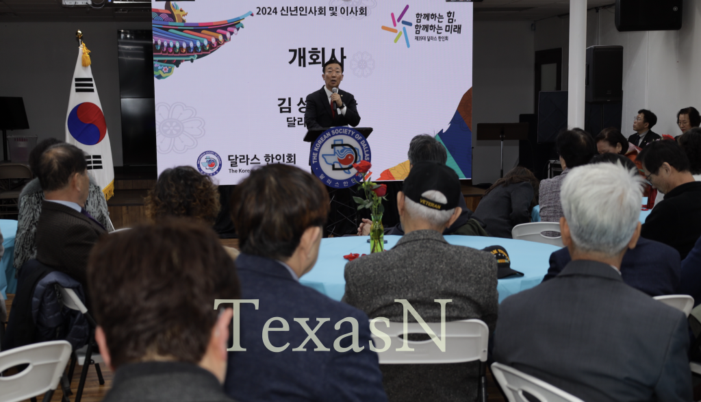 [사진=텍사스] 지난 25일(목) 한인문화센터에서 한인단체장들이 대거 모인 달라스한인회 신년인사회에서 김성한 회장이 한인사회 모든 단체장 및 임원들에게 인사말을 전하고 있다.