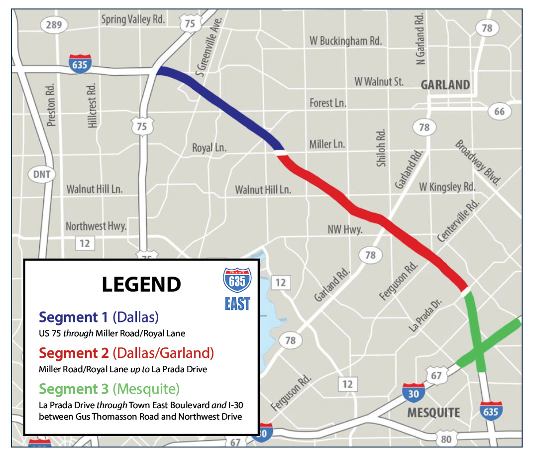635번 고속도로는 1969년에 완공돼 하루에 18만대의 차량 운행을 수용할 수 있도록 설계됐다. 하지만 최근 하루 평균 23만대의 교통량을 보이며 텍사스 전체에서 가장 혼잡한 도로 30위안에 들 정도가 됐다. 따라서 텍사스 교통위원회는 텍사스내 대도시의 혼잡도로와 정체를 해결하기 위해 시작한 ‘텍사스 클리어 레인’ 사업에 635 이스트 프로젝트를 지정, 혼잡완화와 메트로 도시간 원활한 연결을 위해 확장공사를 결정했다.