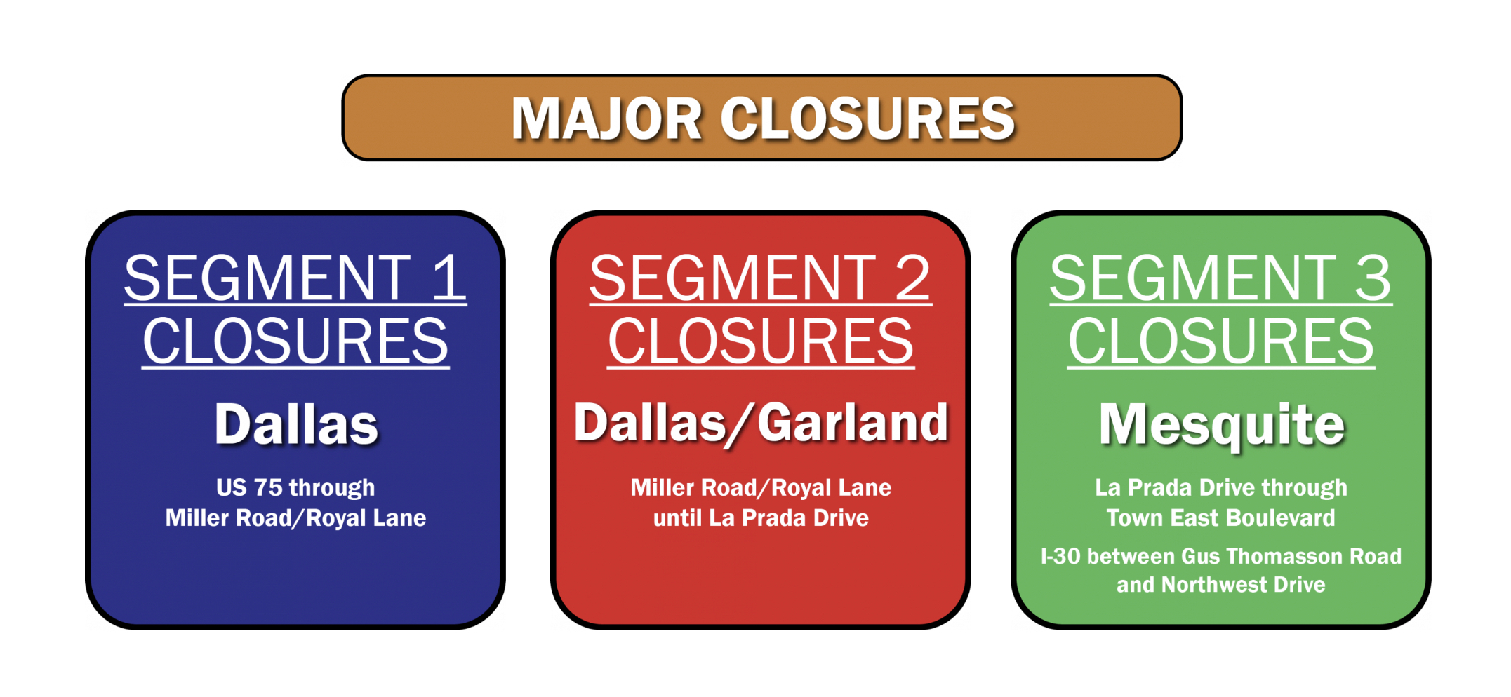 정확한 도로 위치와 폐쇄 시간 및 기간은 텍사스 도로교통국 산하 635 프로젝트 홈페이지(https://635east.com/be-in-the-know/closures-traffic-pattern-changes/) 에서 확인할 수 있다.
