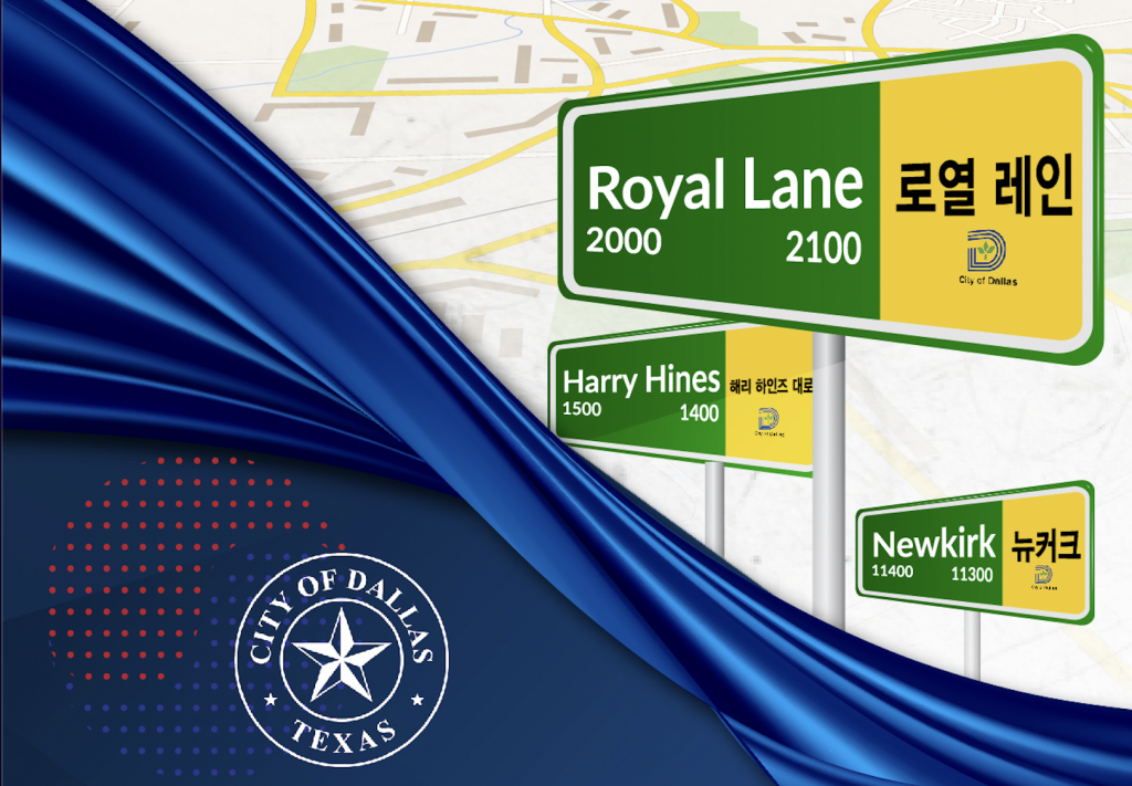 오는 13일(금) 해리하인즈와 로얄레인이 만나는 지점에 위치한 영동회관 주차장에서 달라스시가 주관하는 ‘한국어 번역 거리 표지판 제막식’이 거행된다. 제막식에는 오마르 나르바에즈 임시 부시장 및 달라스 시관계자들, 한인사회 인사들이 참석할 예정이다.