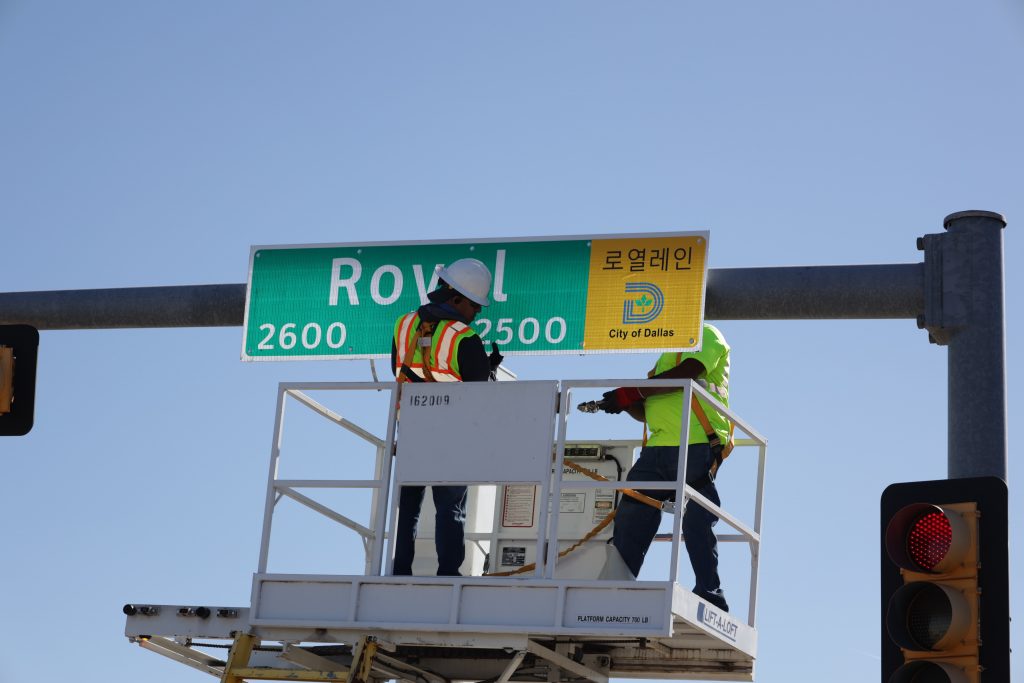 13일(금) 달라스 로얄레인과 해리하인즈 블리바드 교차로에는 영어와 한국어가 병기된 도로 표지판이 공개됐다.