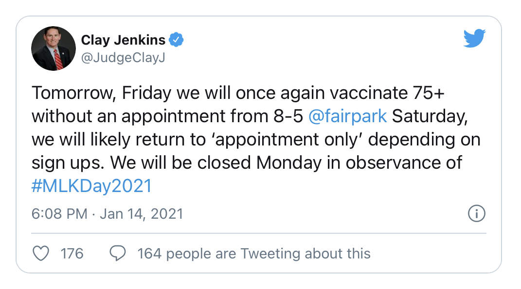 텍사스주 달라스 카운티는 15일(금) 75세 이상 노인을 대상으로 예약이 필요없는 백신접종을 실시한다. 75세 이상 노인 누구나 페어파크(Fair Park vaccine hub, 3809 Grand Avenue) 게이트 5번과 6번 입구에서 입장하면 된다. 백신 접종은 오전 8시부터 오후 5시까지다.