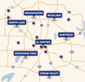 달라스 칼리지는 엘 센트로(El Centro) 캠퍼스와 브룩헤이븐(Brookhaven), 노스레이크(North Lake), 리치랜드(Richland)캠퍼스를 포함, 총 7개의 캠퍼스로 구성되어 있다.