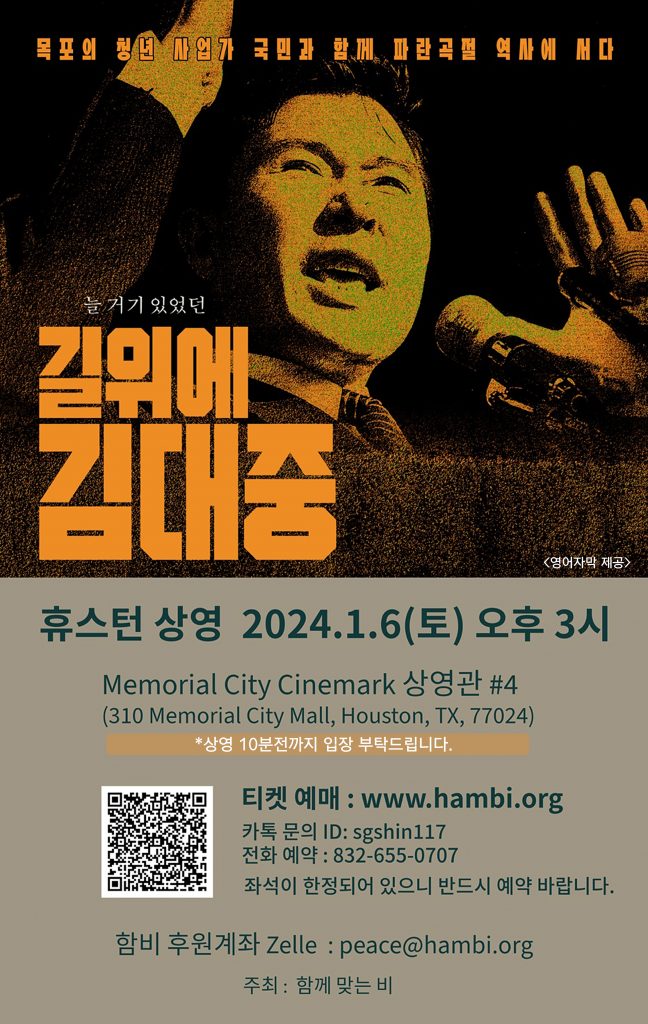 1월 6일 다큐멘터리 영화 ‘길위의 김대중’ , 휴스턴 메모리얼 시티 시네마크에서 상영