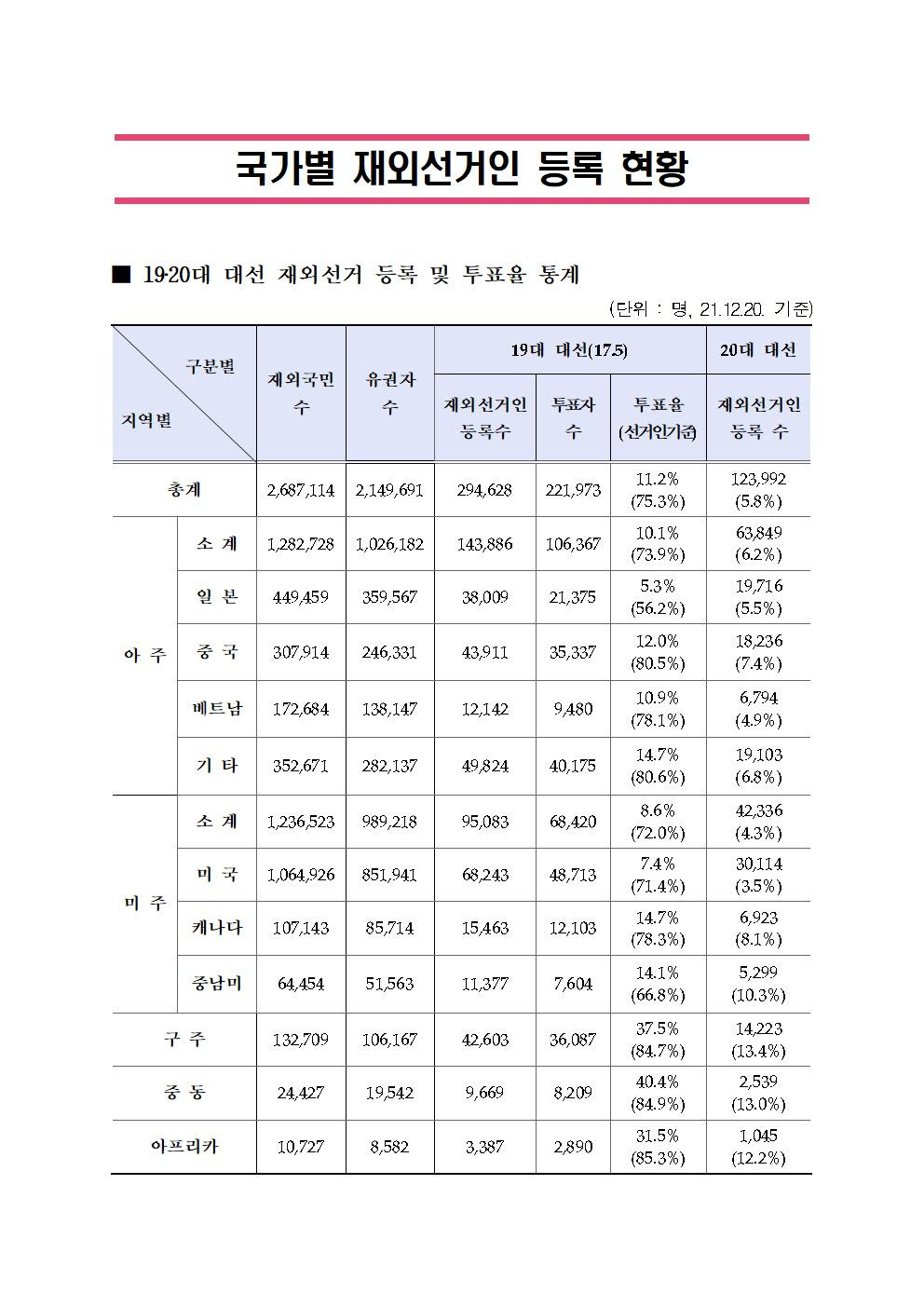 12월 20일(월) 기준 국가별 재외선거인 등록현황에 따르면 투표권을 가진 재외국민수는 214만 9,691명으로 지난 19대 대선당시 29만 4,628명이 등록한 반면 20대 대선에서는 12만 3,992명만이 등록한 것으로 나타났다.
