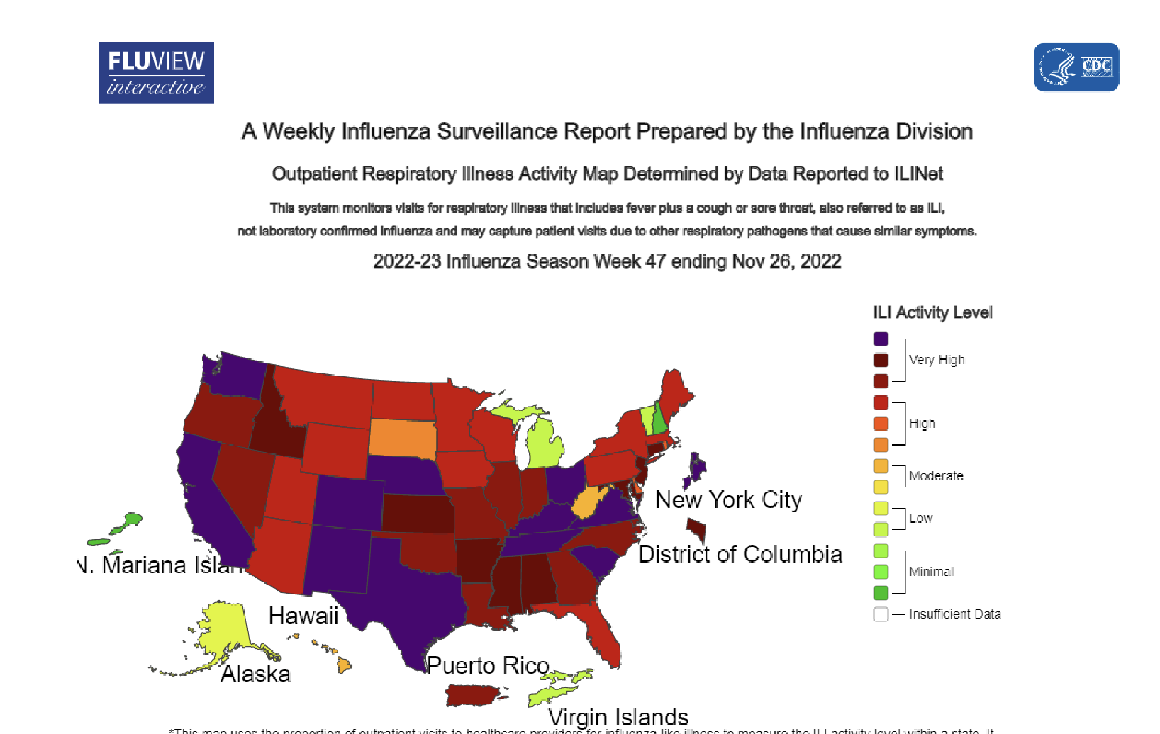 CDC 그래프에서 독감환자가 발생이 높은 지역으로 워싱턴주와 캘리포니아주를 비롯한 서부와 텍사스를 중심으로 하는 중남부, 테네시와 버지니아 포함 동북부 지역에서 많은 환자가 발생하고 있다.