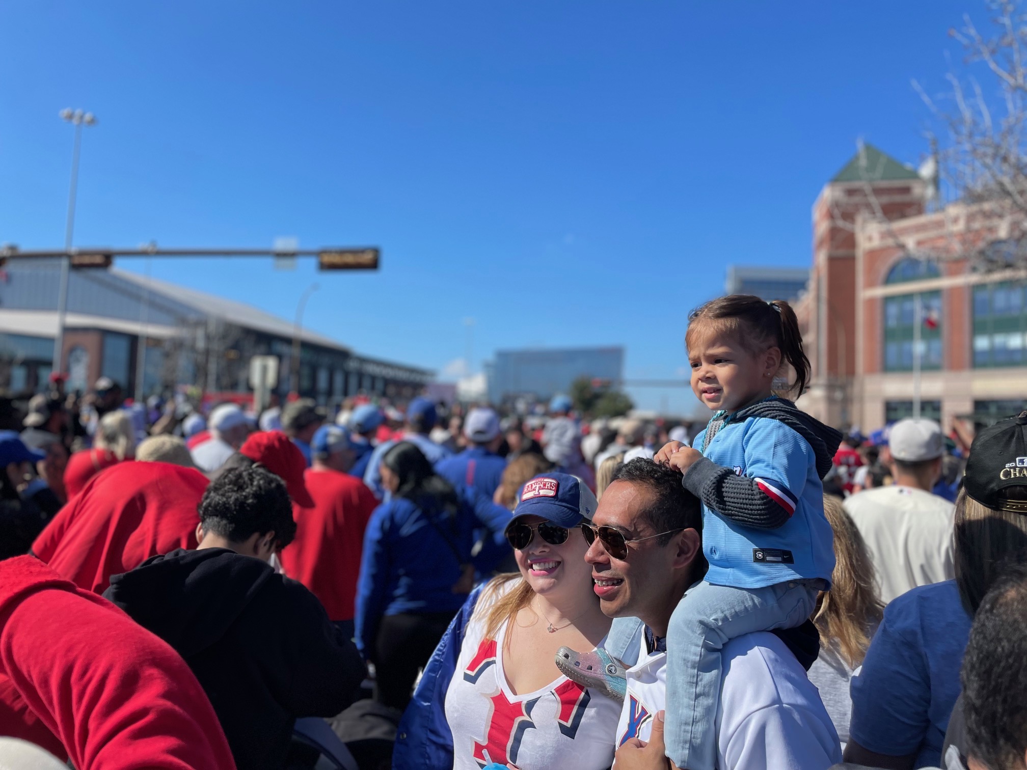 [창단 63년 역사상 최초로 미국 메이저리그 월드시리즈 챔피언에 등극한 텍사스 레인저스를 축하하는 퍼레이드에 북텍사스 한인 야구팬들도 함께 했다. 사진은 달라스 거주 백인호 씨 가족이 현장에서 직접 촬영한 사진이다. /편집자 주]