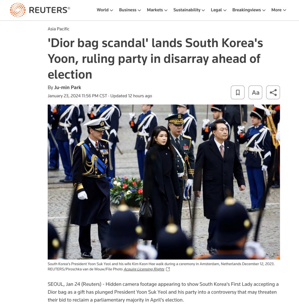 로이터는 ”영부인이 디올백을 선물로 받는 모습이 담긴 몰래카메라 영상이 윤석열 대통령과 여당(국민의힘, 로이터 표기 PPP)이 4월 총선을 앞두고 혼란에 빠뜨리고 있다“고 보도했다.