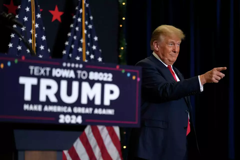 사진/ AP (Former President Donald Trump greets supporters as he arrives at a commit to caucus rally, Tuesday, Dec. 19, 2023, in Waterloo, Iowa.Charlie Neibergall/AP)