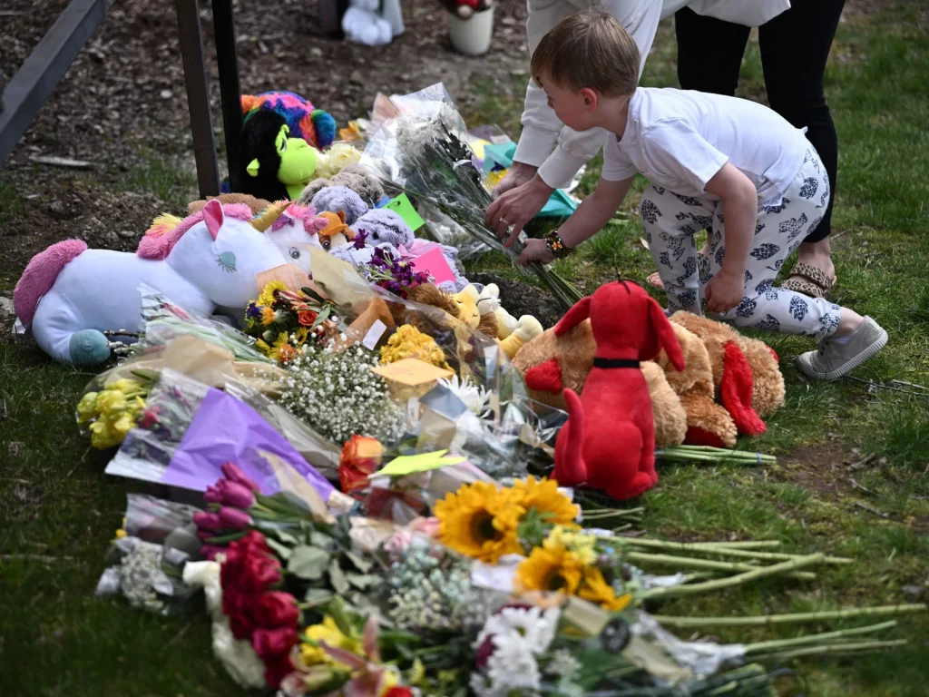 사진/ NPR (A boy leaves flowers at a makeshift memorial for victims by the Covenant School building.BRENDAN SMIALOWSKI/AFP via Getty Images)