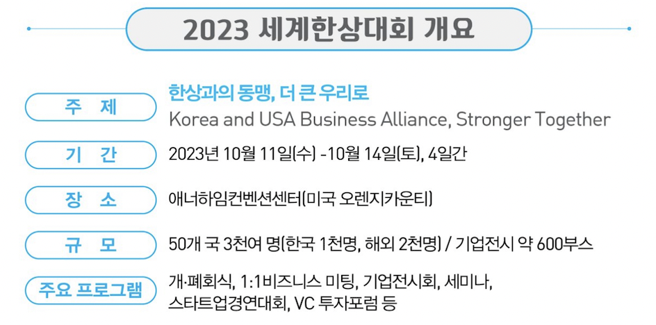 오는 10월 11일(수)부터 10월 14일(토)까지 4일간 미국 오렌지카운티 에너하임 컨벤션 센터에서 열리는 세계한상대회는 50개국에서 약 3천여명의 참가하고 600여개의 기업전시가 열린다.