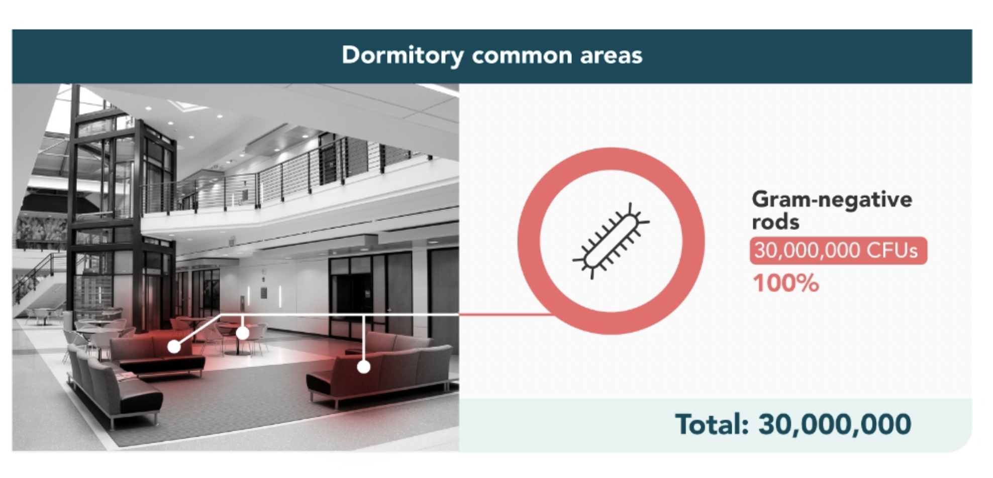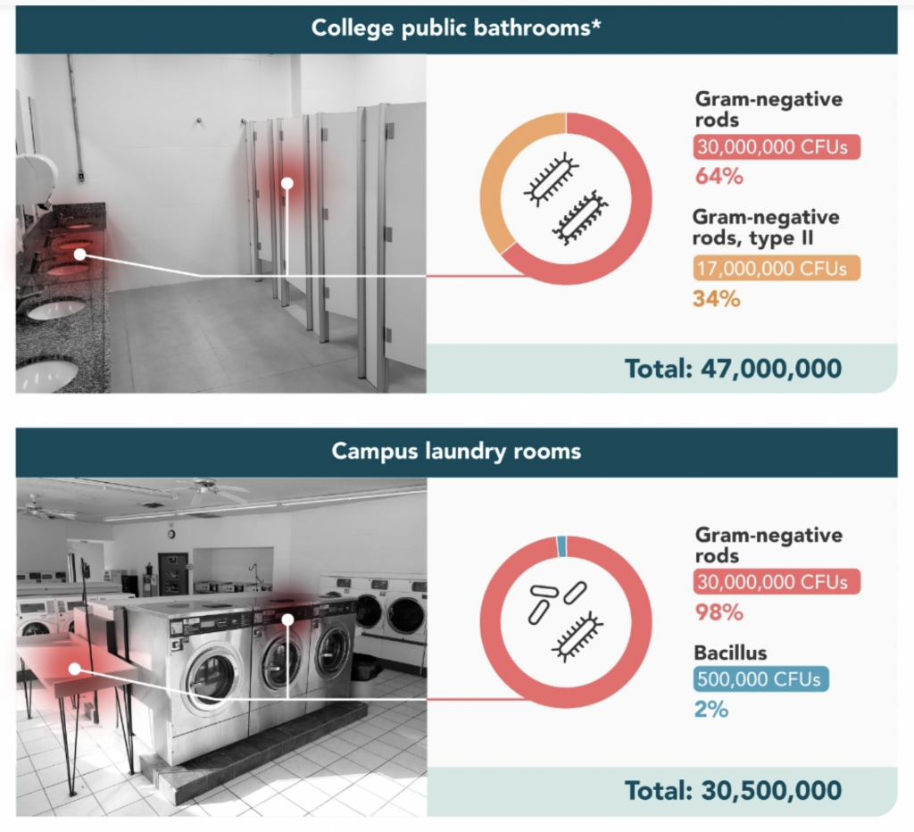 칼리지로버가 발표한 자료에 따르면 공용세탁실에는 변기보다 평균 21배 더 많은 유해 박테리아가 서식했다. 위생 습관 설문조사에서는 응답자의 15%가 기숙사를 한달에 한번 청소한다고 답했고 40%는 침대 시트를 세탁없이 한달 이상 사용한다고 답했다.