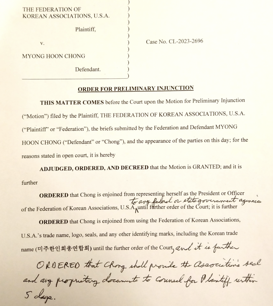 양측의 접점을 찾지못한 갈등은 결국 법정으로 이어졌고 버지니아 법원은 국승구 회장 측이 제기한 임시가처분 신청을 받아들이면서 정명훈 총회장은 미주한인회총연합회 명칭과 로고, 깃발 모든 것을 한동안 사용할 수 없게 됐다.