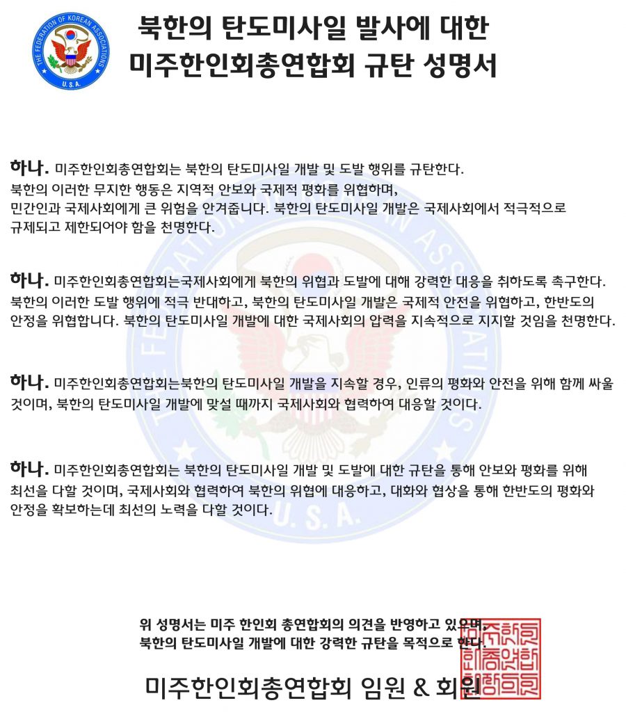 <em>사진/ A mobile missile launcher awaits the order to fire a Hwasong-18 intercontinental ballistic missile from an undisclosed location in North Korea in this undated picture.</em> 미주한인회총연합회 임원 및 회원들이 북한의 탄도미사일 발사에 대한 규탄성명을 발표했다. 다음은 성명서 전문이다. <img class="alignnone wp-image-21748 size-large" src="https://texasnarchive.com/wp-content/uploads/2024/02/TalkMedia_i_9f2213309739-900x1024.jpg" alt="" width="900" height="1024" />