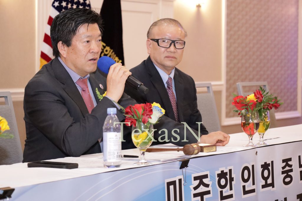 [사진=텍사스N] 미주한인회 중남부연합회 고경열 회장인 지난 23일(토) 달라스에서 열린 정기총회에서 단체명 및 로고 도용하는 또다른 중남부연합회 김희철 신임회장에 대한 법적 대응을 안건으로 상정하며 강경대응 방침에 대한 배경을 설명하고 있다.