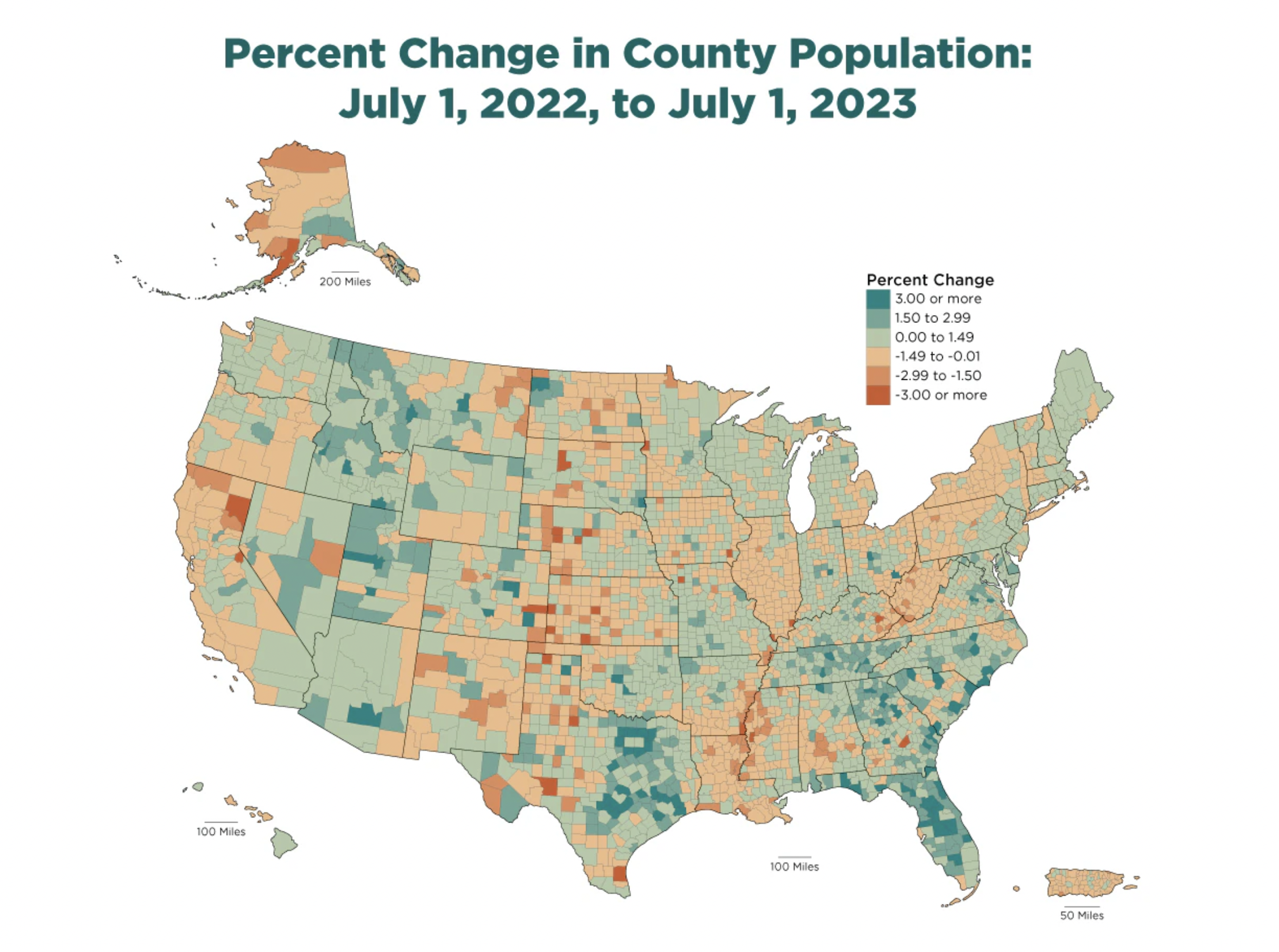 미국 인구조사국이 지난 14일(목) 발표한 미국 인구 및 변화구성요소에 대한 연구데이터 결과에 따르면 남부 지역 카운티는 더 빠른 성장을 보이고 북동부와 중서부 지역 카운티는 인구감소가 증가했다.