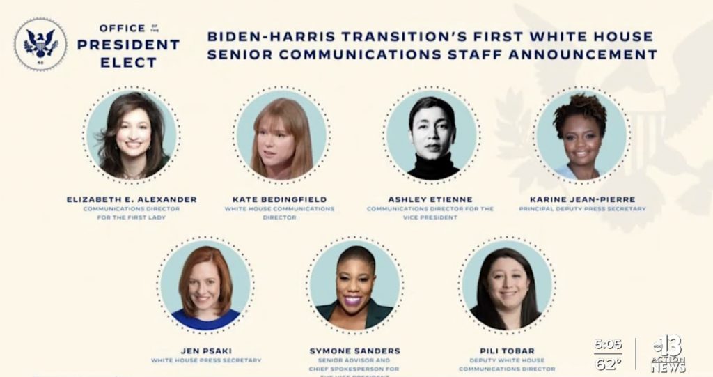 조 바이든 대통령 당선인은 29일(일) 백악관 공보팀 전원을 여성으로 지명했다. 이는 미 역사상 처음이다.