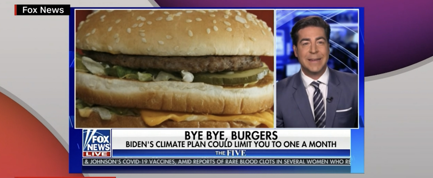 폭스뉴스는 23일(금) 오전 방송에서 5명의 패널이 참가해 조 바이든 대통령의 기후대책과 관련해 “미국인들은 탄소배출량을 줄이자는 바이든 대통령의 목표를 달성하기 위해서는 소고기와 같은 붉은살 육류를 90% 줄여야 한다. 다시 말해 1년에 고작 4파운드만 먹을 수 있다”는 내용을 송출했다.