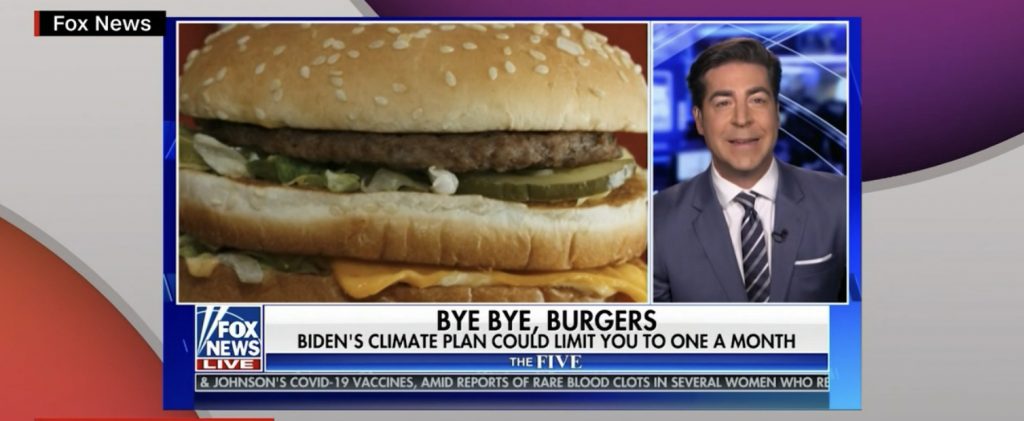 폭스뉴스는 23일(금) 오전 방송에서 5명의 패널이 참가해 조 바이든 대통령의 기후대책과 관련해 “미국인들은 탄소배출량을 줄이자는 바이든 대통령의 목표를 달성하기 위해서는 소고기와 같은 붉은살 육류를 90% 줄여야 한다. 다시 말해 1년에 고작 4파운드만 먹을 수 있다”는 내용을 송출했다.