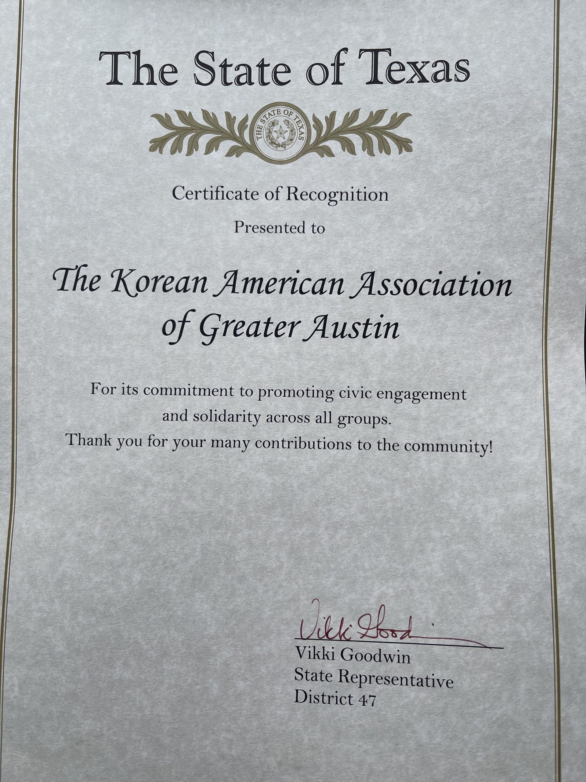 비키 굿윈 의원은 각 커뮤니티 리더들에게 감사장을 전했고 오스틴 한인사회를 대표해 강승원 전 한인회장이 ‘지역사회 발전에 공헌한 한인사회에 대한 감사장’을 대표로 수여받았다.