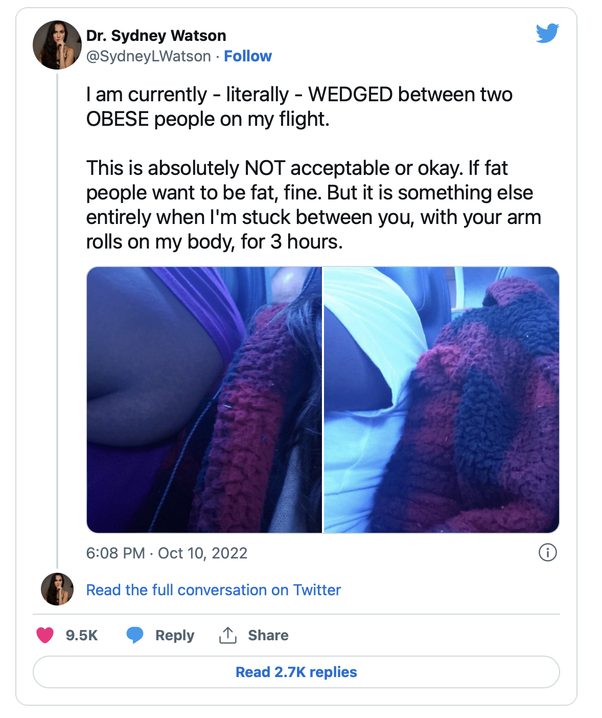 아메리칸 항공을 이용한 여성 승객이 비만 승객 2명 사이에 끼어 타게 된 불편함을 트위터에 올려 논란이 되고 있다. 정치평론가로 활동중인 시드니 왓슨(Sydney Watson)은 지난 10월 10일 비행기 안에서 겪은 불편함을 트위터에 공개했다.