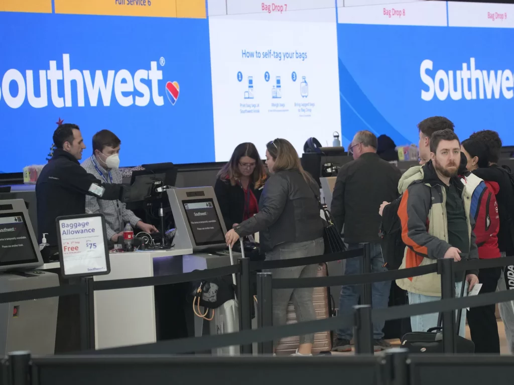 사진/NPR (Travelers are shown lining up at the check-in counters for Southwest Airlines in Denver International Airport, Friday, Dec. 30, 2022, in Denver.David Zalubowski/AP)