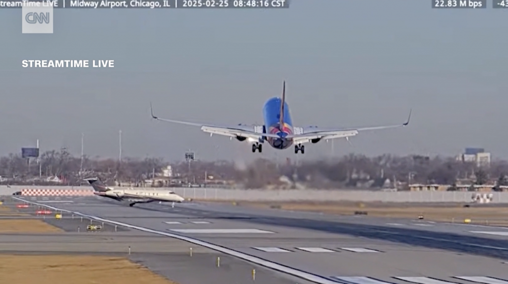 사우스웨스트 항공여객기가 25일(화) 시카고 미드웨이 국제공항에서 착륙을 시도하던 중 활주로를 가로지르던 개인 전세기와 충돌할 뻔 한 사건이 발생했다.