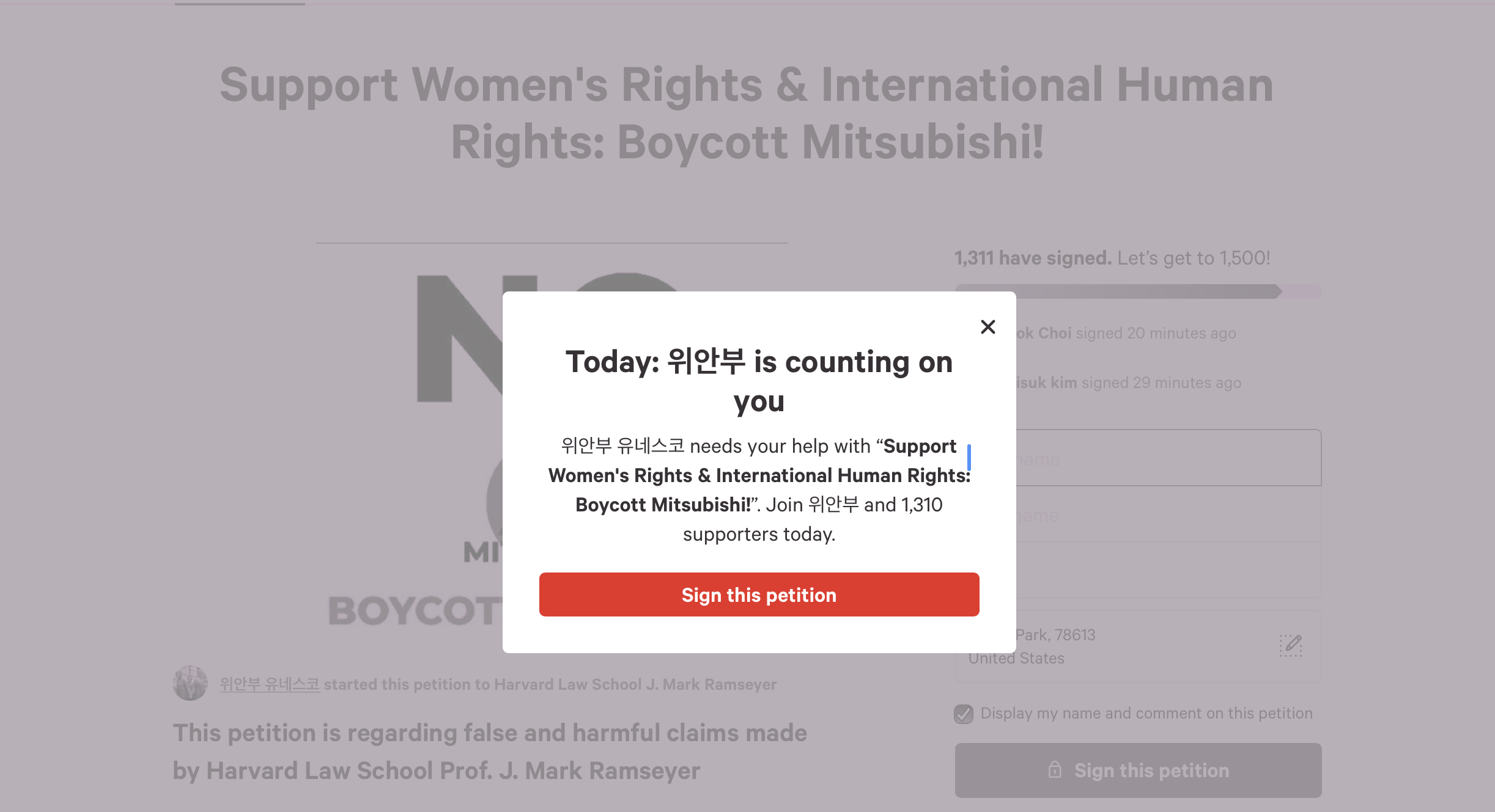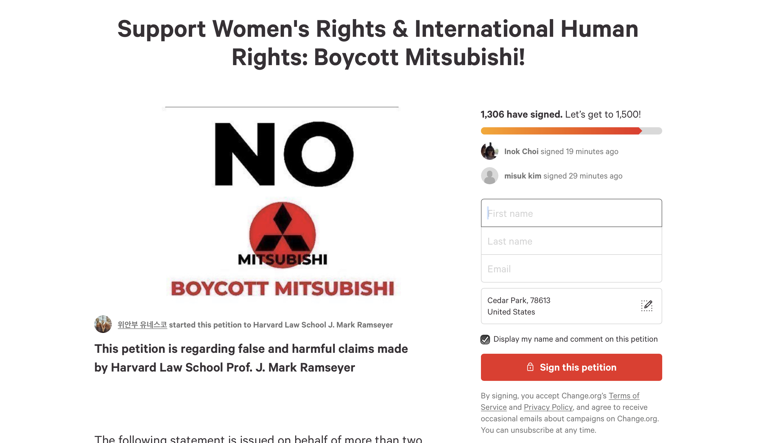 일본군 위안부 피해자를 ‘자발적 매춘부’라고 한 마크 램지어 하버드대 교수의 논문에 공분한 한인들이 일본 기업 미쓰비시를 상대로 한 불매운동에 나섰다. 캘리포니아주의 한인들은 28일  청원 사이트 change.org 에 미쓰비시의 제품을 상대로 불매운동을 전개하자는 청원을 올렸다.