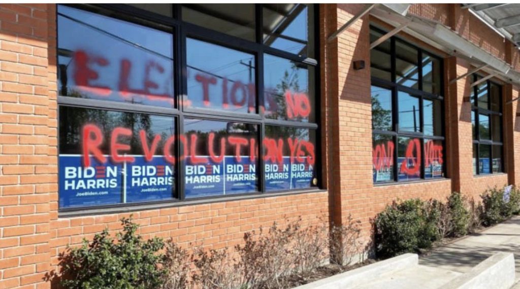 휴스턴 민주당 선거본부가 지난 밤 사이 붉은 색 페인트 낙서로 외벽이 훼손됐다. ‘선거는 노, 혁명은 예스(Election No, Revolution Yes)’라는 낙서에 낫과 망치를 함께 그려 넣은 것이 발견됐다. 해리스 카운티는 텍사스주에서도 가장 높은 조기 투표율을 보이고 있다.
