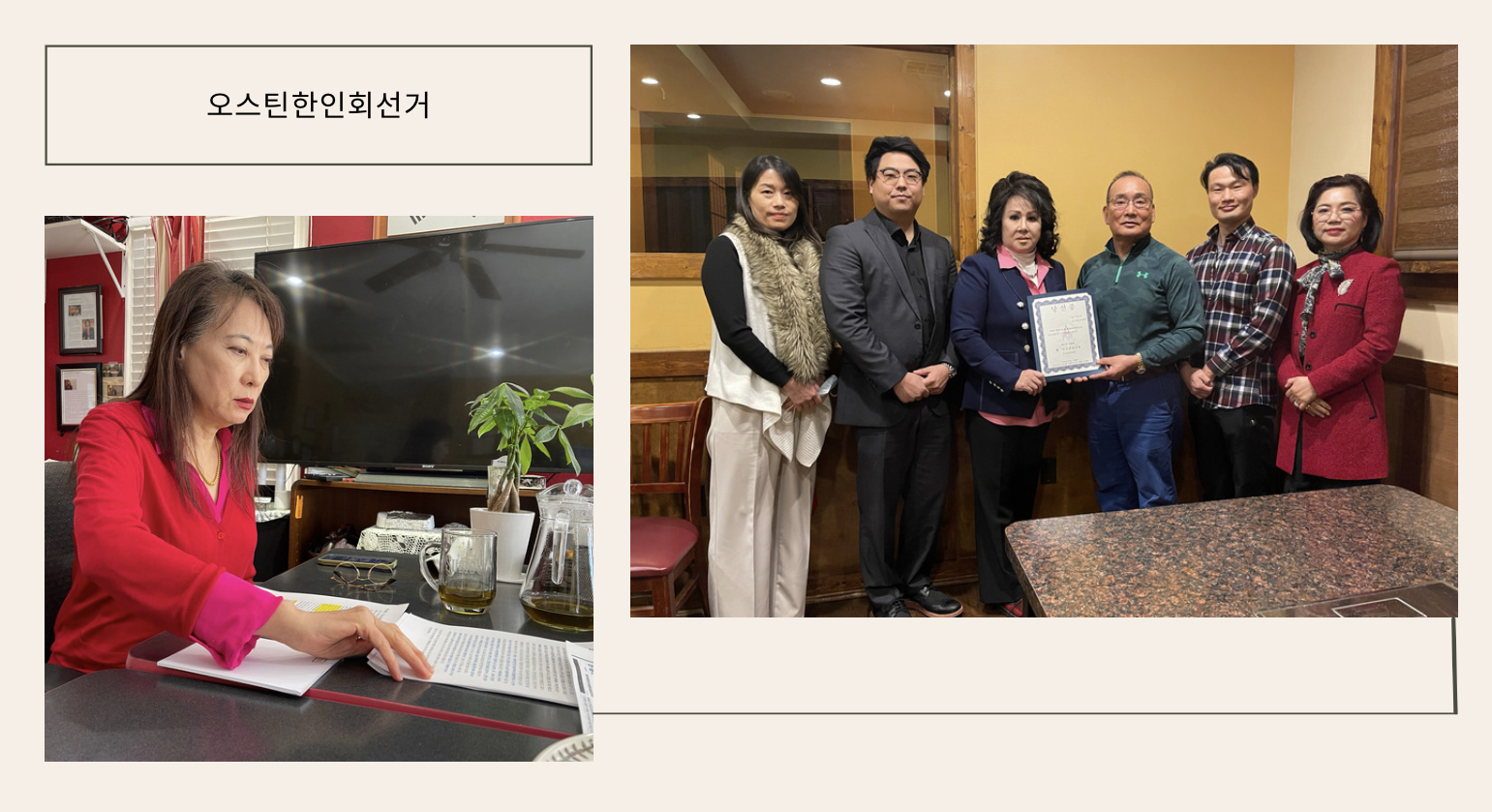 오스틴한인회 선거관리위원회(위원장 박용락)가 이희경 후보에게 당선증을 교부했다. 선관위는 강수지 후보가 자격부적합이라고 판단했다. 따라서 “이희경 후보만이 단독 후보가 됐기에 무투표 당선을 확정했다”고 밝히며 당선증을 교부했다.