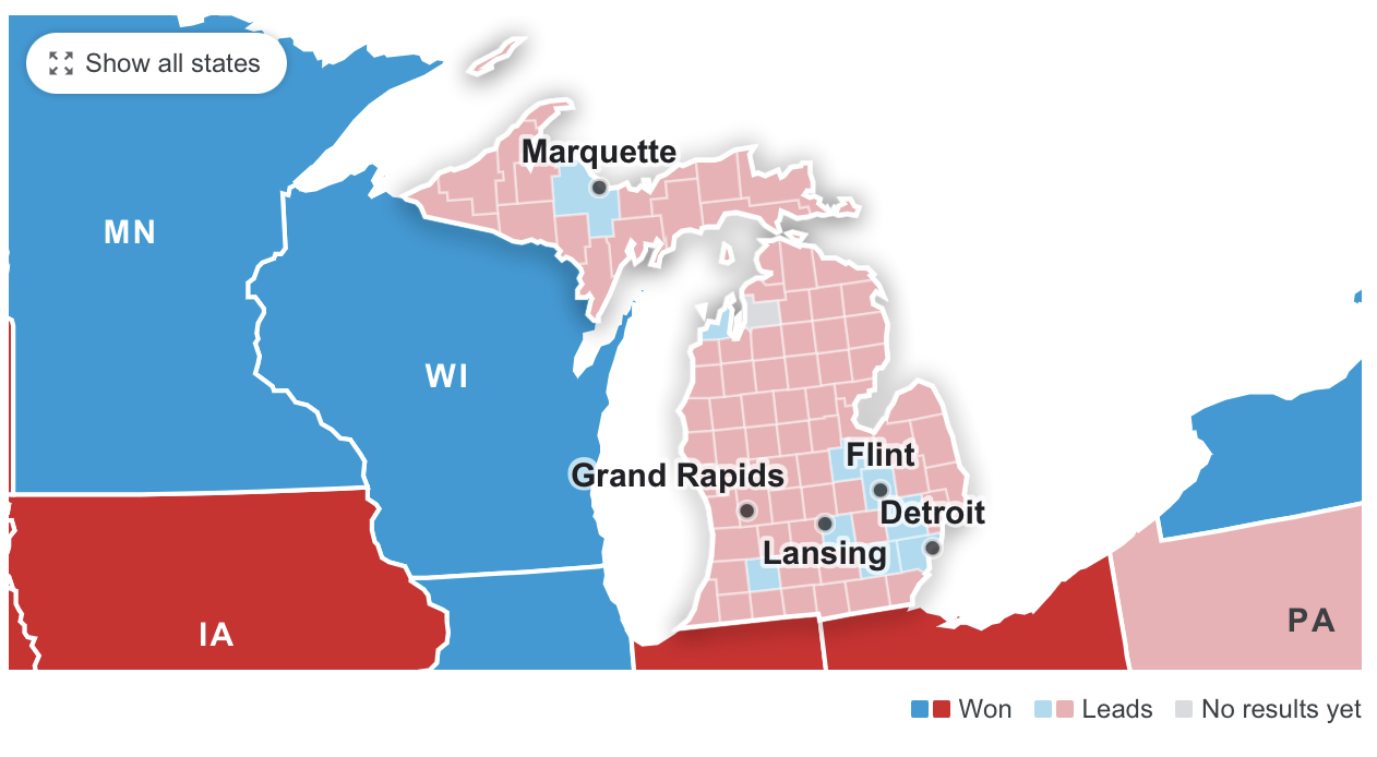 미시건주에서는 투표마감이후 트럼프 대통령이 우세를 보였으나 밤사이 역전되면서 초박빙 격전이 진행됐고, 4일(수) 3시 23분경 49.8% 득표율로 트럼프 대통령이 가져간 48.7%보다 앞섰다.