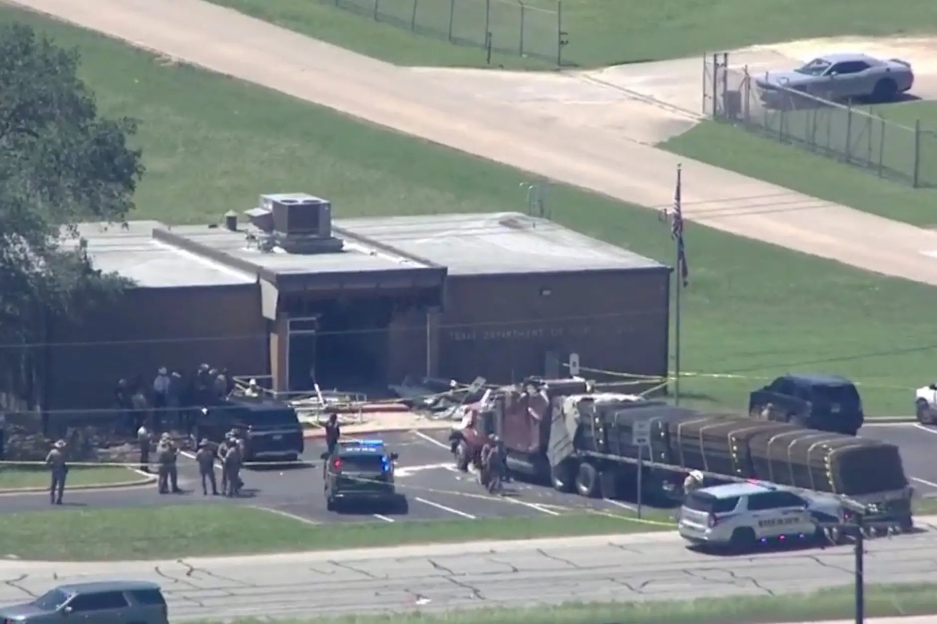 사진/ 뉴욕타임즈 (A person driving a semitrailer truck crashed into a Department of Public Safety Office in Brenham, Texas, on Friday.Credit…ABC13 Houston, via Associated Press)